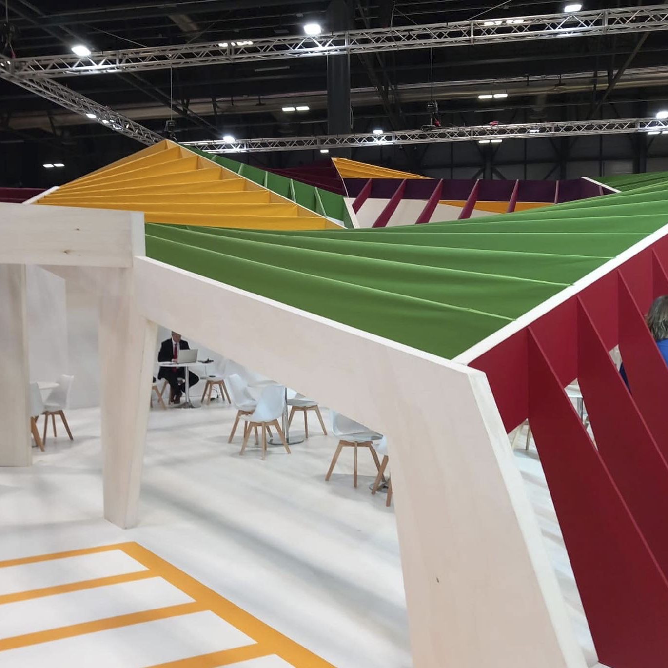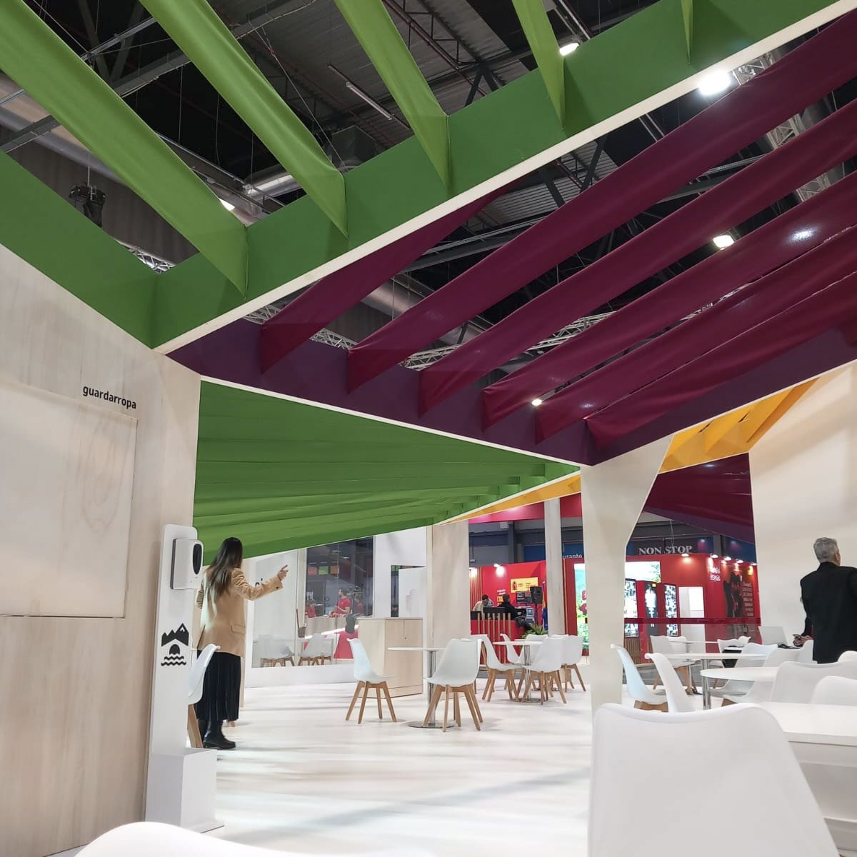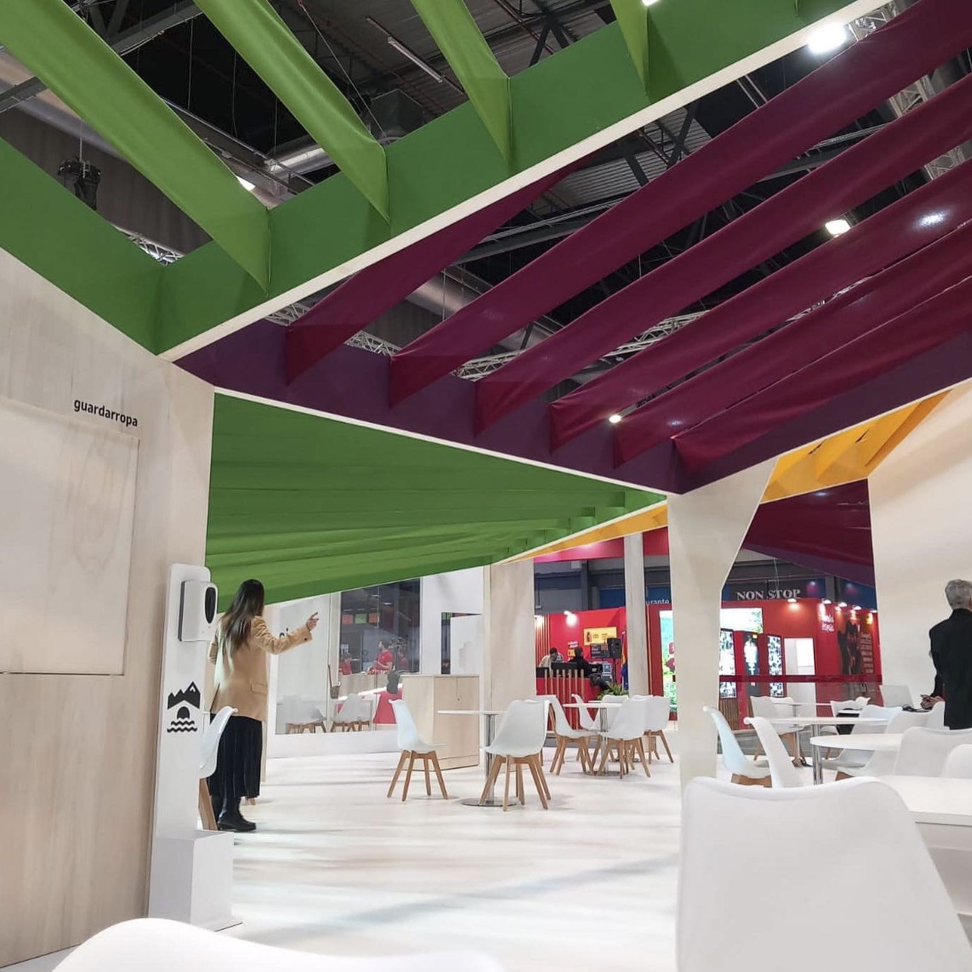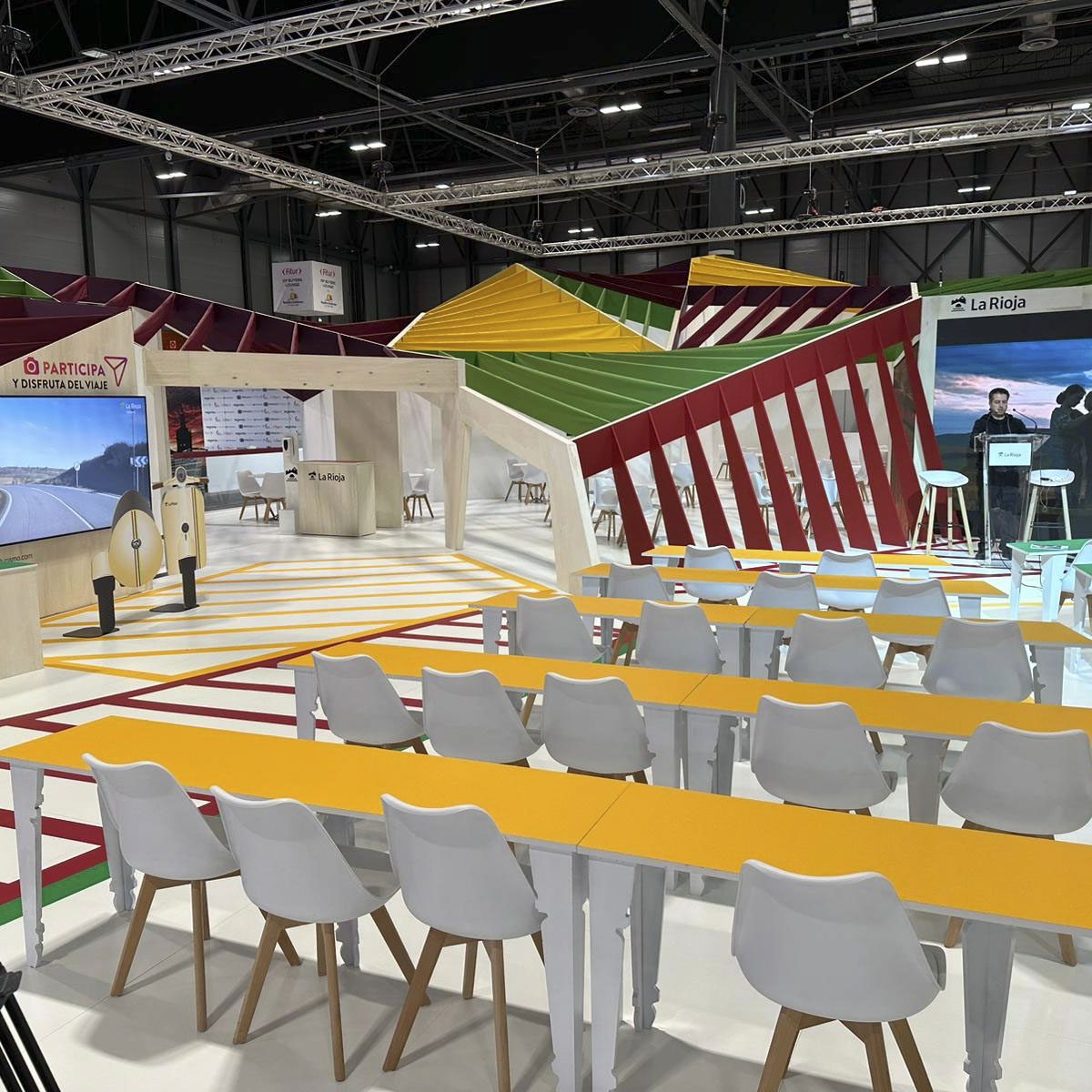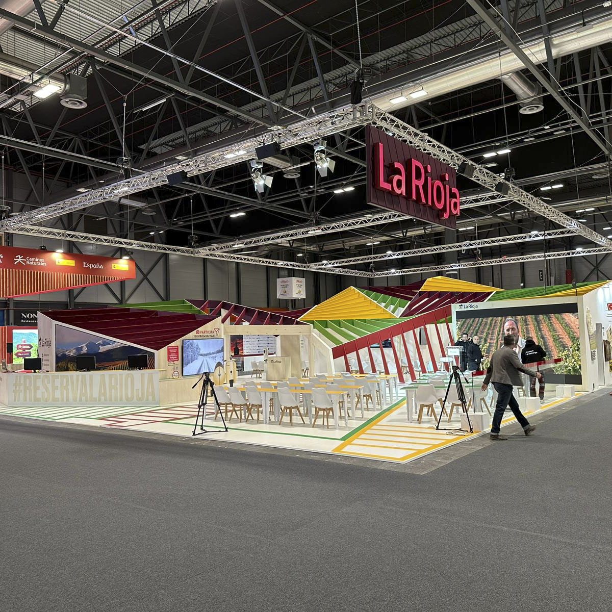 El stand tiene como hilo conductor un elemento tan característico de la tradicional artesanía textil de La Rioja como es la almazuela. Un diseño en el que, a través de un juego de colores que caracteriza al paisaje del viñedo en su época de máximo esplendor, se distribuyen las diferentes zonas del estand para mostrar la gran diversidad de elementos que componen la singularidad de La Rioja como región y destino turístico. De esta manera, las diferentes zonas del estand van tejiendo ese gran paisaje de sabores, sensaciones y elementos que caracterizan la comunidad riojana.